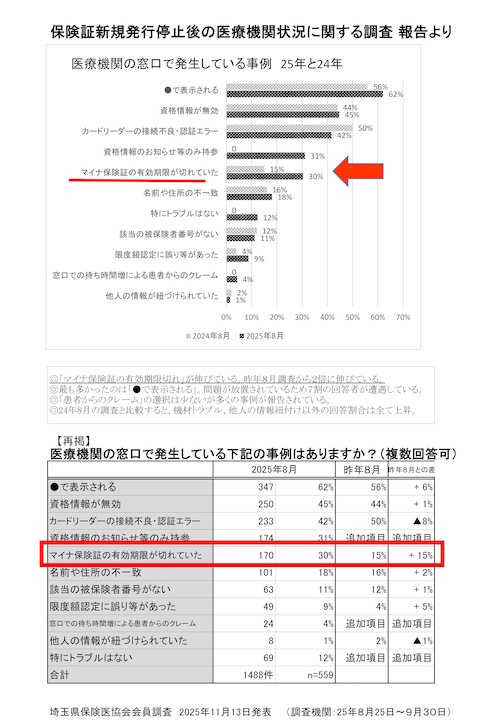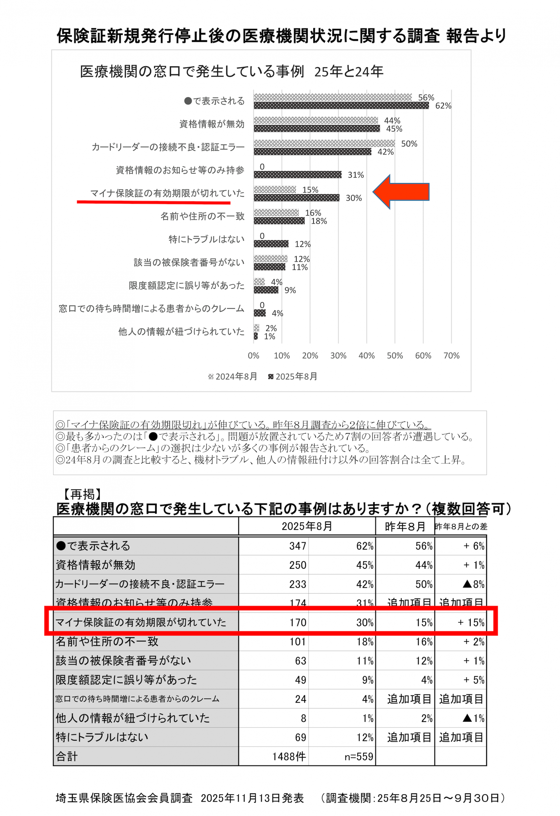 マイナ保険証の「期限切れ」も多数生じており、本会の今年8月~9月時の会員調査では1年前の頃から2倍に増えています。今後も増えることが見込まれますが、バックアップとして保険証が必ず交付されていたこれまでと異なり、マイナ保険証の期限切れ後に資格確認書が確実に交付できているかは各保険者に委ねられているのみで、実態は厚労省も把握していません。